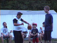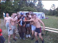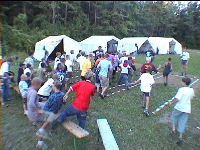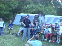 Der Tag fing heute mit dem Aufstehen um 7.30 Uhr (was viel zu früh war) an. Der Tag verlief unter dem Namen "Adi- Tag" (deswegen mußten wir auch so früh aufstehen). Da "Adi- Tag" war musste jeder Teilnehmer und Leiter mind. zwei Dinge um den Hals haben und eine Kappe tragen. Nach dem Frühstuck gab es Sportangebote, unter anderem auch Fußball und Basketball. Nach dem Mittagessen machte das Büdchen und die Kasse auf. um 15.30 gab es dann Bastelangebote wie z.B. Brot backen, Papierflieger basteln oder Essensbeutel bemalen. Nach den Bastelangeboten gab es circa eine halbe Stunde Freizeit bis zum Abendessen. Nach dem Abendessen wurden dann von den Gruppen Sketche über Adi vorgetragen. Den besten Sketch brachte (wie konnte es auch anders sein?) Gruppe eins. Außerdem gab es noch ein Kontest bei dem einer aus jeder Gruppe so viel wie möglich Klamotten anziehen musste. Danach gab es noch einen Witze- Kontest den Sven Piel gewann. Anschließend war Abendgebet, dass von Thomas Polland vorgetragen wurde. Danach war dann Nachtruhe.