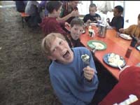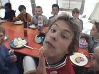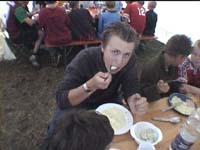 Zwiebeln und Kartoffelpüree). Beim Abendgebet redeten wir über den Tag und teilten vier Brote unter uns auf