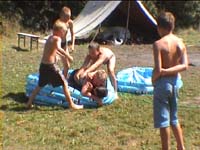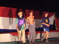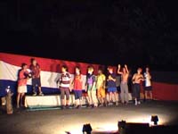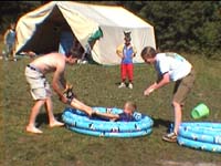 Heute durften wir bis 9:00 Uhr schlafen, bevor wir eine ganze Reihe von Angeboten zur Auswahl hatten. Standarts wie Fußball wurden ergänzt durch nützliche Dinge wie Klamottenwaschen und Holzholen oder Exotischeres wie Hard-Body-Workout und Discotanz. Nach dem Mittagessen gabe es Chillout und Thrill Contest. Abends wurden dannn die olympischen Lagerspiele in einer feierlichen Zeremonie ausgewertet, wobei Roland Odenthal gewann und Stephan Liedtke eine hervoragende Leistung mit dem 16. Platz krönte. Die Zeremonie selbst war sehr spannend, vor allem am Schluss; mit einer riesigen Fete endete der Abend. Dann zog sich Gruppe 1 noch bis tief in die Nacht zurück und feierte in der VIP-Lounge (Essenszelt) mit ausgewählten Gästen den Sieger...!